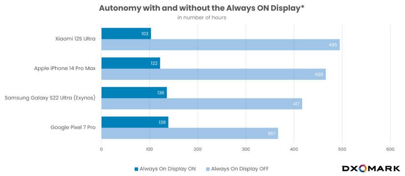 Недавно специалисты лаборатории DxOMark решили проверить, как влияет активная функция Always-on Display на автономность смартфонов — как работающих под управлением операционной системы Android, так и iOS. При этом в тестах принял участие Xiaomi 12S Ultra.
